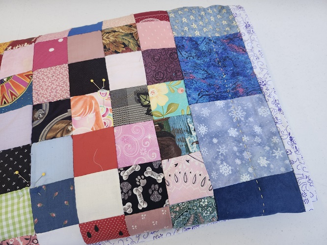I sure did not get as much done as I thought I could on the hand sewn quilt. I did get the binding completely on. In the meantime, I kept seeing spots where pieces weren’t sewn together. You can see just 2 of those spots marked by pins in my picture. Now I’m trying to decide if I am taking this quilt back to Inman to finish, or leaving it at home to work on when I am home for the weekends.