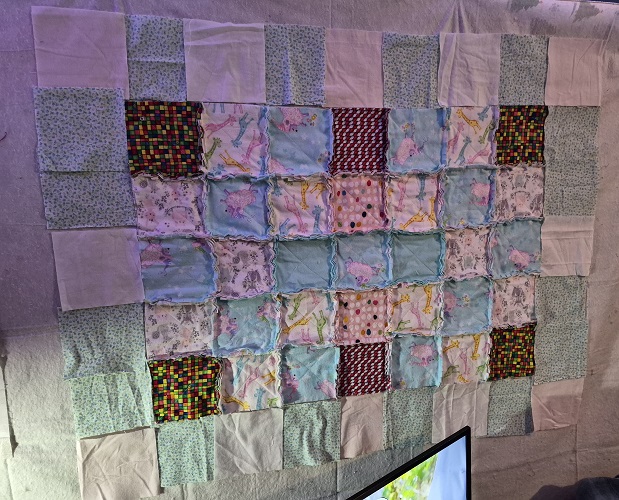 I found out that my granddaughter, Araya, will be having her baby shower soon. If you remember, I made a rag baby quilt for her, but thought it was too small. This has become my right now project to ensure it’s done on time. I have to use flannels on hand. This picture is just the top pieces around so I could see what it will look like. I am actually a bit further as I did the top row. I needed to make sure that adding rows around would work since I had already trimmed the edges. It looks like it will work out fine.